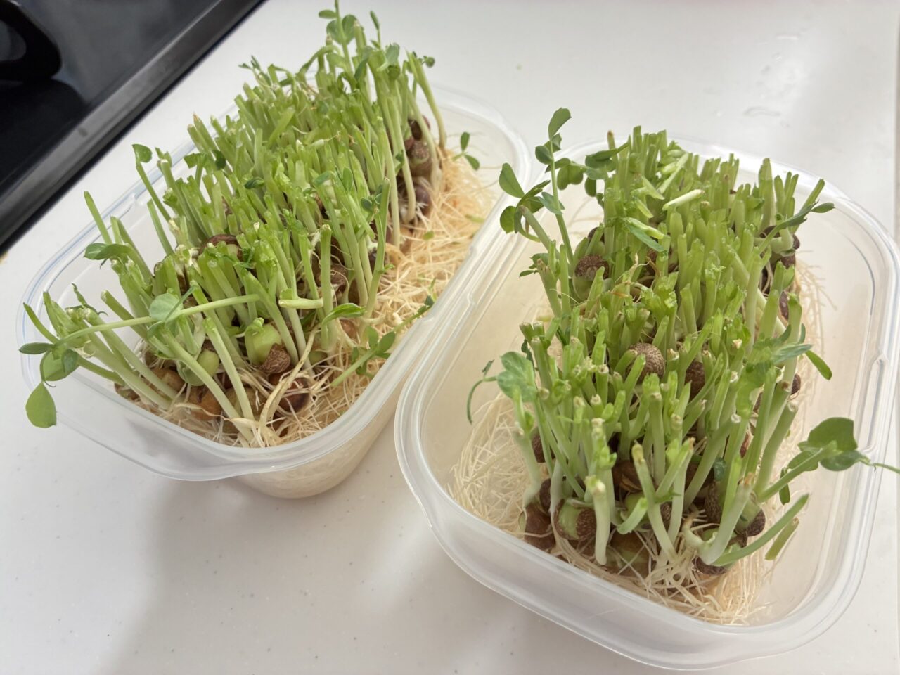 栽培を始めて数日で、豆苗ははっきりと伸び始めました。朝起きて様子を見ると、前日より背が高くなっています。