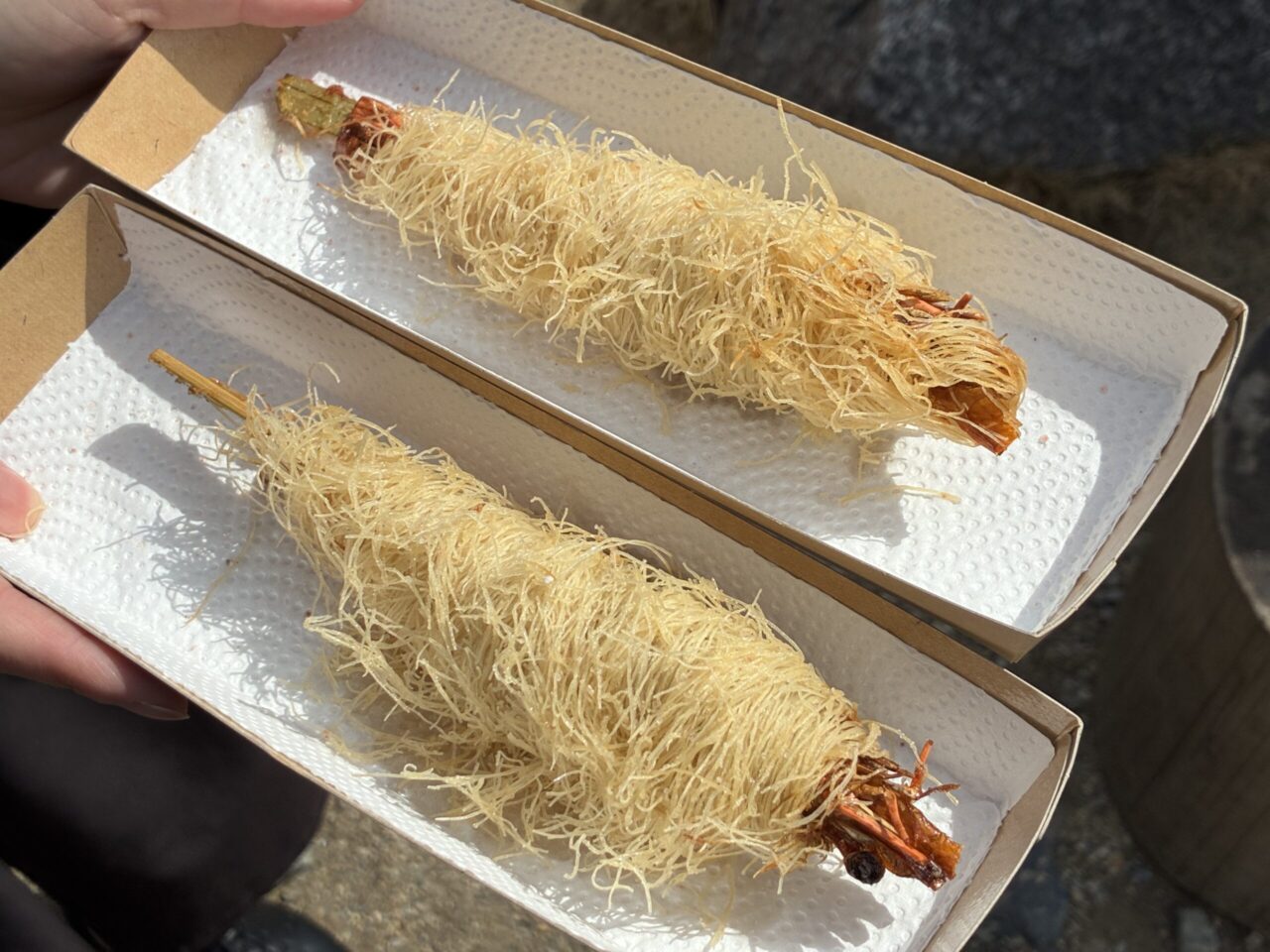 最初に食べて印象に残ったのが、新兵衛屋の海老のパリパリ天です。海老まるごと一尾を『カダイフ』で包んで揚げた天ぷらで、見た目から少し変わっています。
